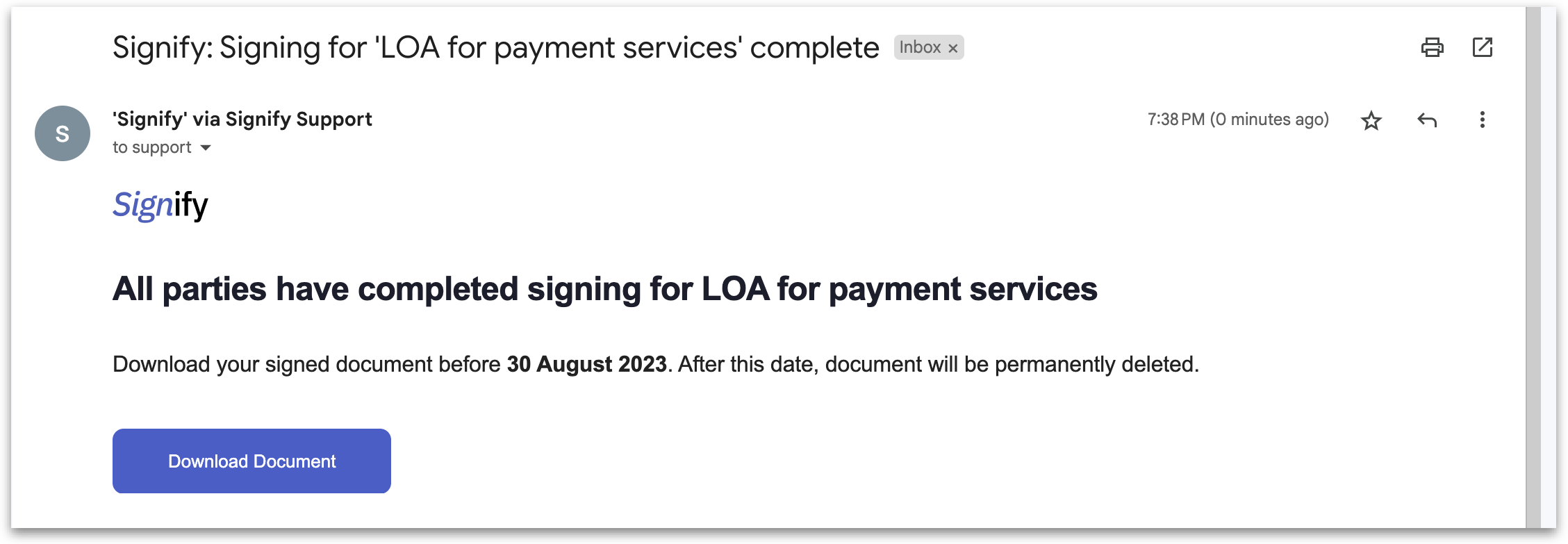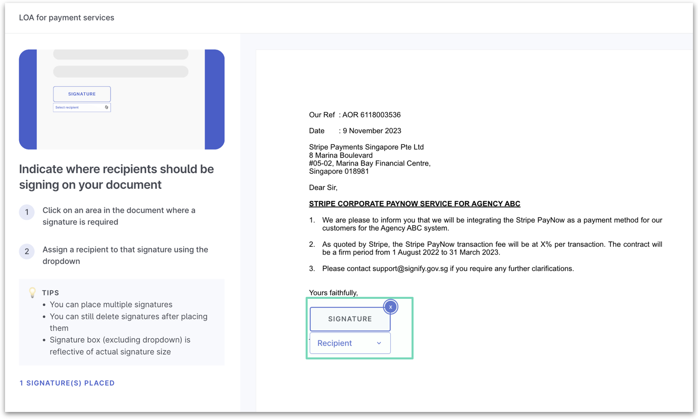 Please note that typically 1 signature is sufficient as Signify signatures applies to the entire document. If you have a workflow today that requires capturing a signature on every single page, do consider making changes as it is no longer necessary.&#x20;